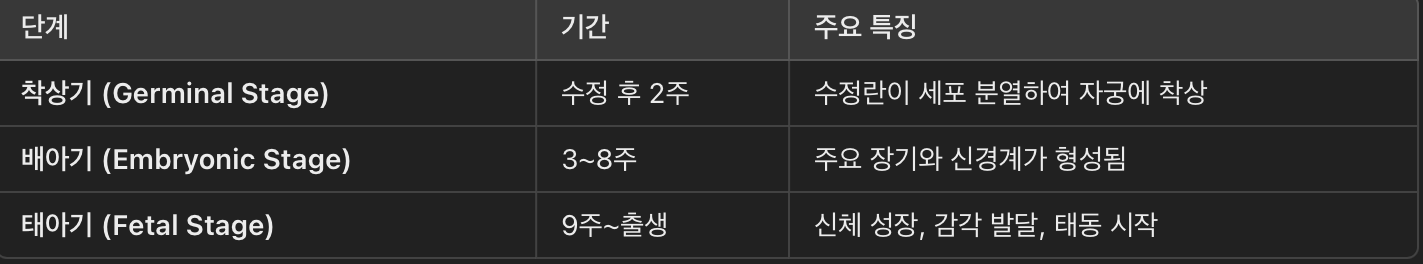 이 시기는 세포 분열, 기관 형성, 신체 성장이 급격하게 이루어지며, 출생 후 신체적·인지적 발달의 기초가 마련됩니다.