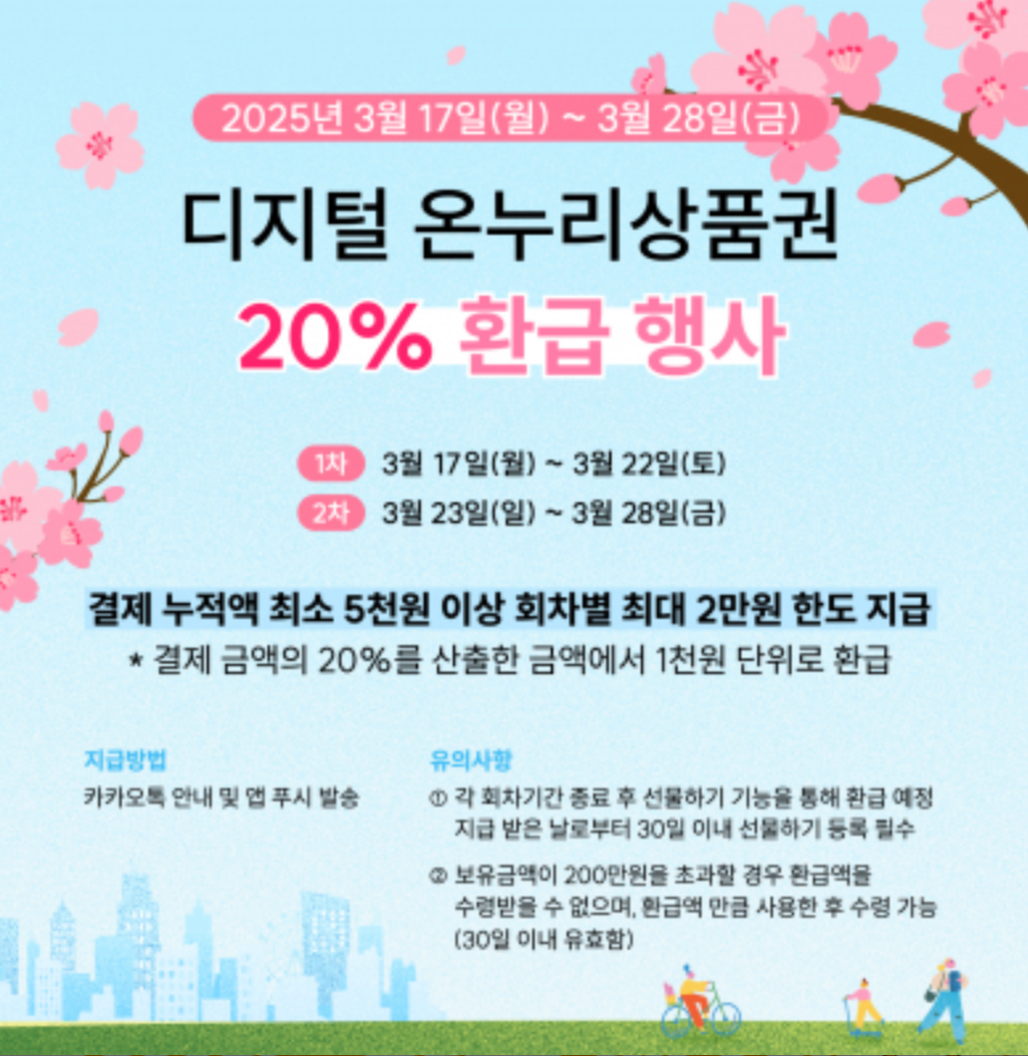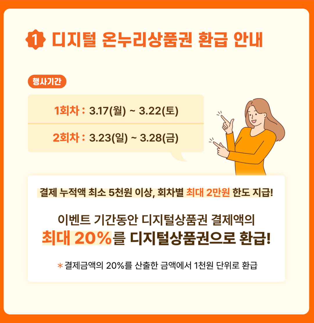 이 기간 동안 전통시장 및 상점가에서 디지털 온누리상품권으로 결제 시, 결제 금액의 최대 20%를 환급해주는 행사였습니다.